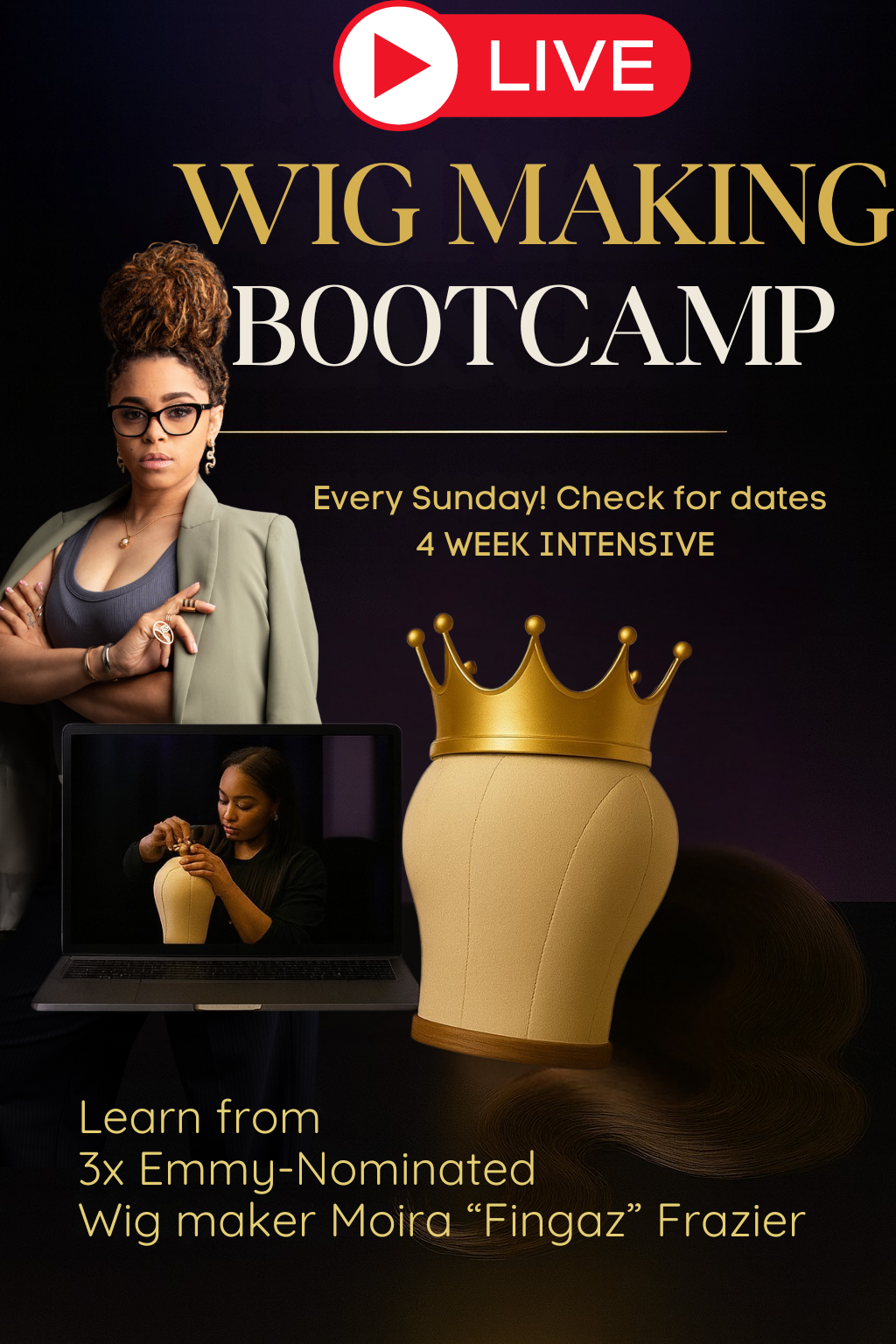 This isn’t a pre-recorded course. It’s a live, interactive experience where you’ll learn directly from me, get real-time feedback, and leave with a finished, camera-ready wig you can proudly sell or wear.